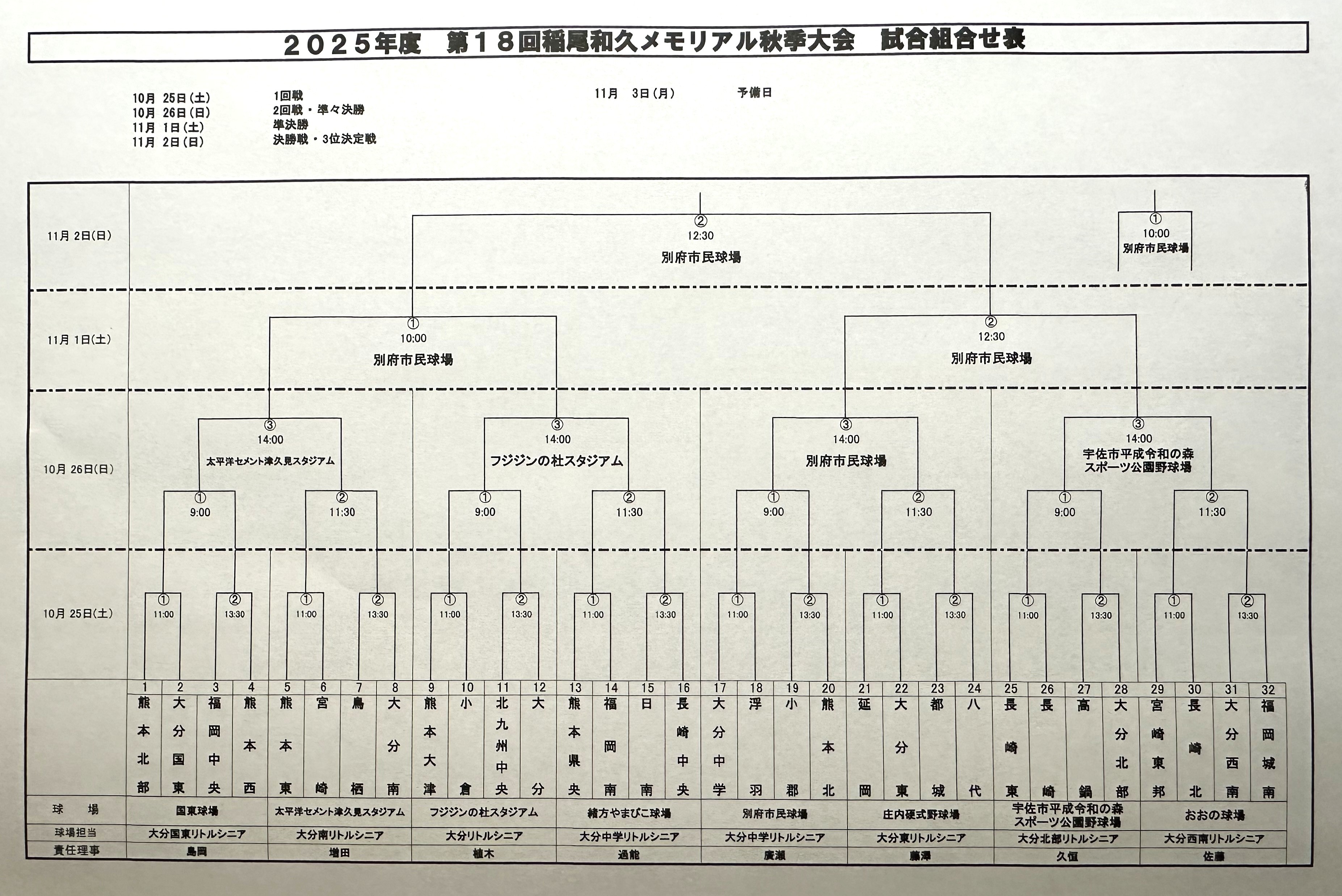 2025稲尾和久メモリアル秋季大会 2025年度 第18回稲尾和久メモリアル秋季大会が開催されます 大会日 10月25日(土)26日(日) 11月1日(土)2日(日) 予備日 11月3日(月) 大分西南リトルシニアは初戦おおの球場にて『福岡城南リトルシニア』との 対戦となります。応援よろしくお願いします!