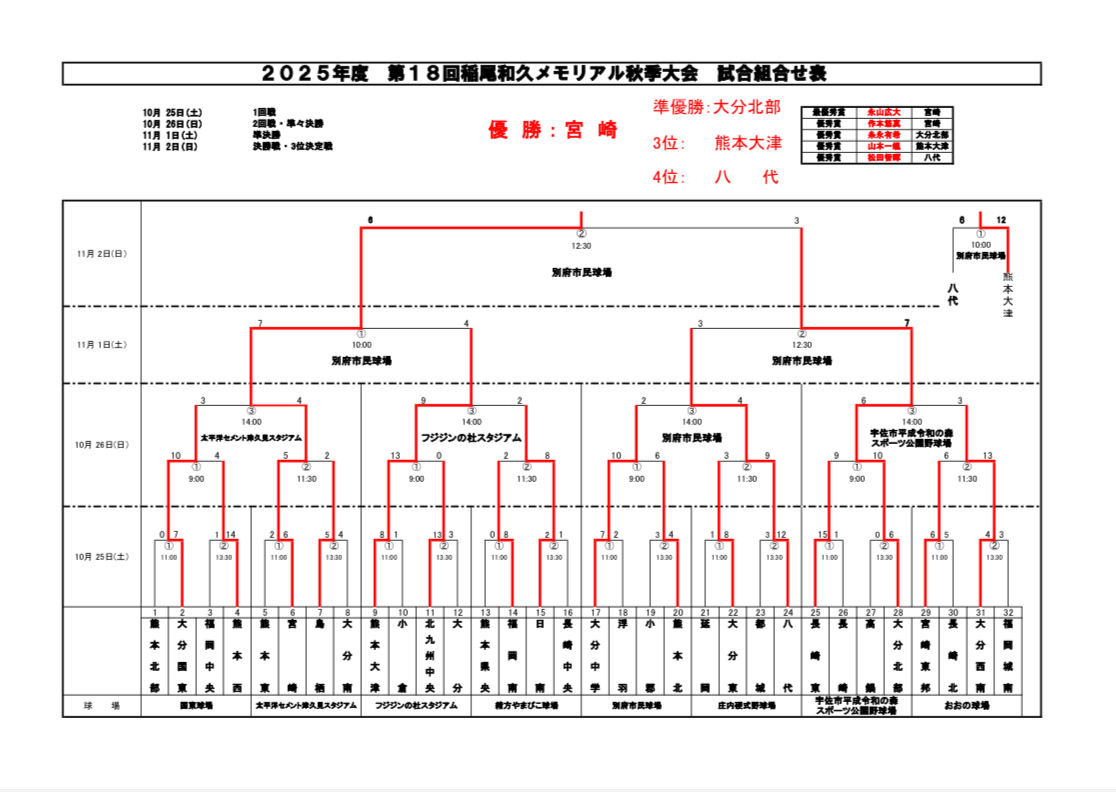 2025稲尾和久メモリアル秋季大会-結果- 2025年度 第18回稲尾和久メモリアル秋季大会 大分西南リトルシニアはベスト8となりました。12名の選手が力を合わせ頑張りました! 多くの方々から大会の協賛、応援を頂き大変感謝を致しております。 ありがとうございました。